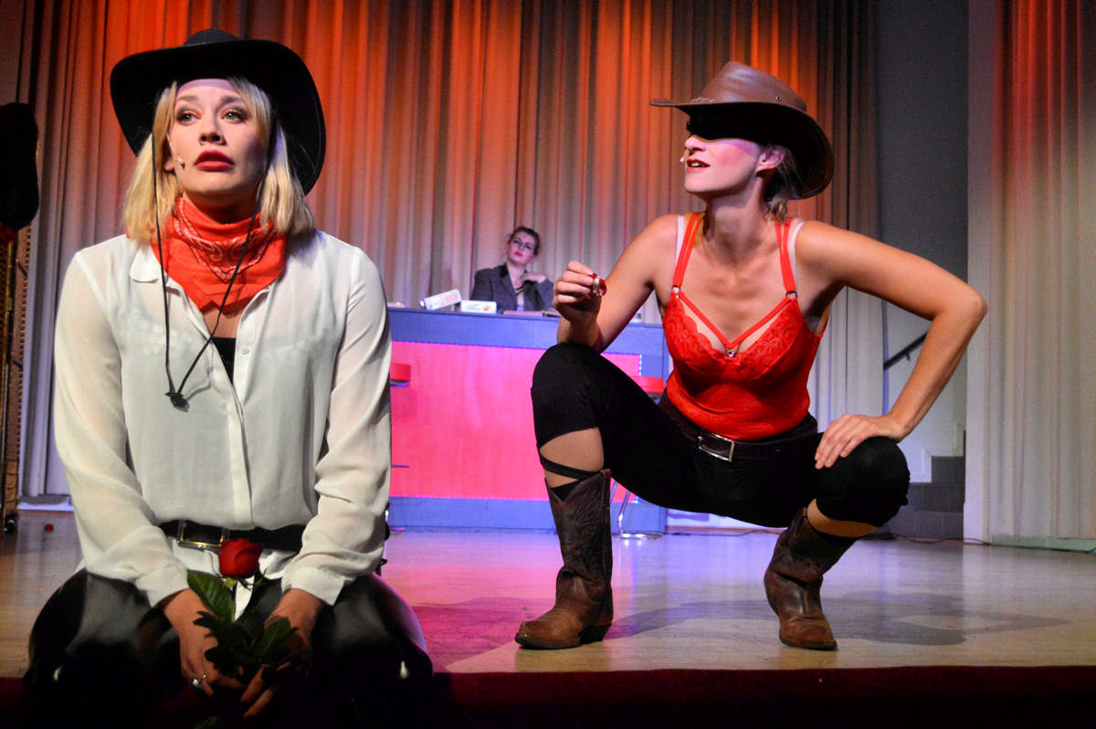 Die Rahmenhandlung in Darmstadt gibt drei Bühnenkünstlerinnen vor, die sich in Coronazeiten in einem Etablissement durchschlagen müssen. Frankie, der Besitzer, ist kein Unmensch und so dürfen die drei Damen einmal im Monat einen bunten Abend gestalten. Ein Überwurf, Cowboystiefel, eine Krone markieren die Figure. Wer sich auskennt, hat am Bildungsmarathon seinen Spaß. Wer nicht, freut sich am Show-Charakter, denn alle drei zeigen komisches Talent, singen und tanzen.